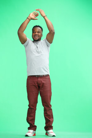 A man, full-length, on a green background, clapping