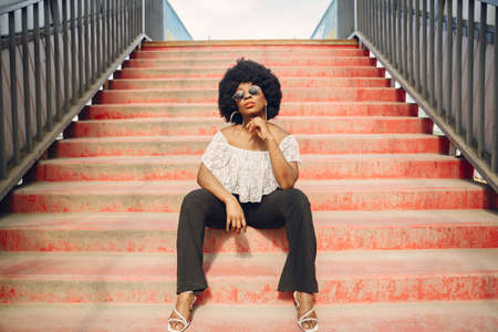 young beautiful african american woman in black leather jacket and white sneakers posing in the city streets