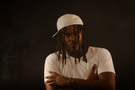 Salvador, Bahia, Brazil - August 30, 2025: Man with dreadlocks wearing a white hat with crossed arms posing for a photo isolated on a black studio background. Salvador, Brazil.
