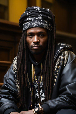Portrait of an hip hop music musician. Cinematic image of a man wearing white clothes and jewels