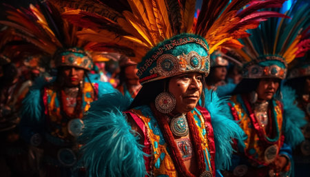 Indigenous men and women celebrate traditional festival with multi colored clothing, dancing and smiling generated by artificial intelligence