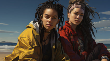 Two girls friends are sitting on the beach against the background of the ocean and sky. It's a cool autumn day, the girls are dressed in a red and yellow jacket