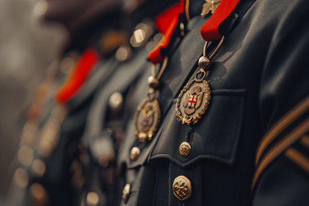 A collection of medals and ribbons are displayed on a table. The ribbons are of various colors and sizes, and some of them have a star on them. Scene is one of pride and accomplishment
