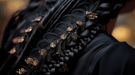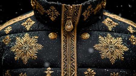 This close-up image features a luxurious black winter jacket adorned with stunning gold embroidery. The intricate snowflake patterns create a stylish and elegant look, perfect for cold weather fashion.