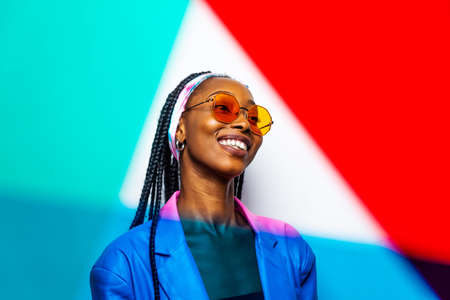Beautiful afro-american woman with afro pigtails hairstyle and stylish clothes - Portrait of young black girl in studio