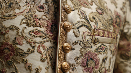 This close-up showcases exquisite embroidery on vintage fabric, featuring rich floral patterns and elegant gold buttons, highlighting craftsmanship and artistry.