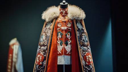 This stunning historical garment, showcased in a museum, features intricate patterns and rich colors, highlighting the exquisite craftsmanship of royal attire.