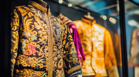 A stunning display of traditional garments featuring intricate embroidery and vibrant colors, capturing the beauty of cultural heritage and textile craftsmanship in an elegant boutique setting.