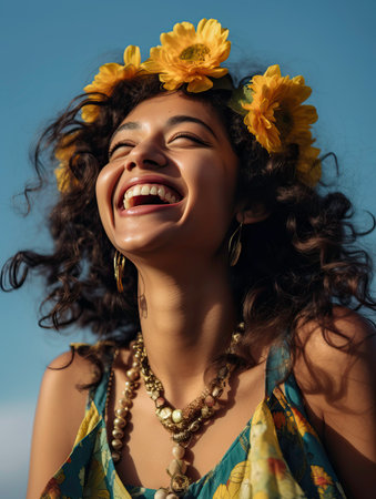 A woman wearing a colorful dress is smiling and looking at the camera. The dress is adorned with flowers and has a green and yellow pattern