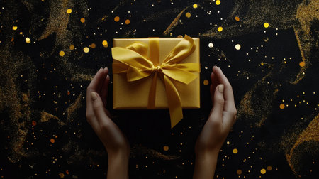 A black and gold holiday theme featuring a hand holding a gift box wrapped in yellow satin ribbon, with sequins scattered on a black backdrop.