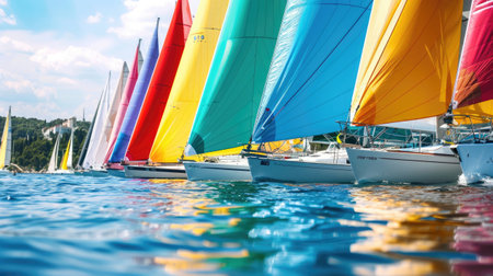 A fleet of vibrant sailboats with colorful sails racing on the blue water of the sea under a clear sky