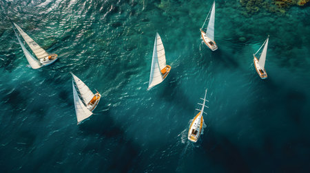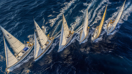 Top-down view of sailing yacht regatta in open ocean, boats aligned in competition, representing strategy, skill, and marine sports