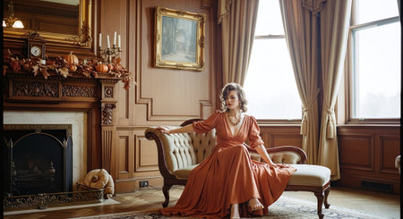 Beautiful woman in a long orange dress in the interior of the room