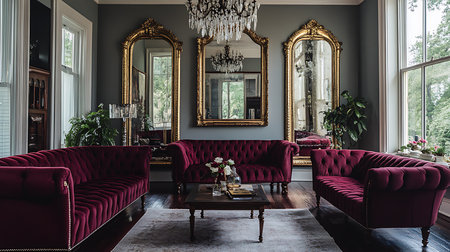 Discover this elegant living room showcasing vintage mirrors and cozy furnishings.