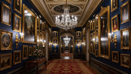 A long hallway features numerous framed portraits adorning dark blue walls, complemented by ornate gold accents. A large chandelier hangs overhead, illuminating the scene. The composition presents symmetrical perspective, suggesting a historical indoor setting. Suitable for editorial or design purposes, the scene evokes a sense of grandeur.