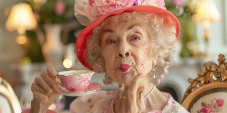 A woman in a pink hat is holding a cup of tea