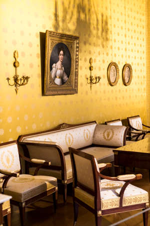 Castle interior, art gallery, baroque upholstered furniture with red upholstery, sofa and armchairs, paintings in gilded frames on walls, renaissance chateau Opocno, Czech Republic, June 12, 2021