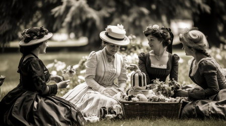 Regency Era English Garden Picnic in Black and White elegantly dressed ladies and gentlemen enjoy a monochrome picnic