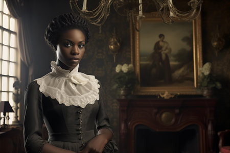 Portrait of beautiful noble aristocratic black woman wearing elegant dress. Royal female person headshot. Generative AI