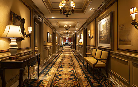 Luxury hotel lobby interior with a long corridor and ceiling light