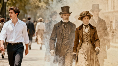 A young man walks through a sunlit city street while ghostly sepia Victorian figures drift beside him. The cinematic composite contrasts contemporary life with historical memory.
