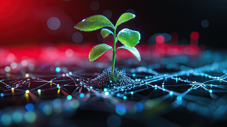 Young plant on a circuit board, green tech concept, side lighting, macro focus