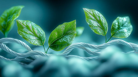 Conceptual eco-technology of green leaves emerging from twisted white cables, symbolizing sustainability and innovation.