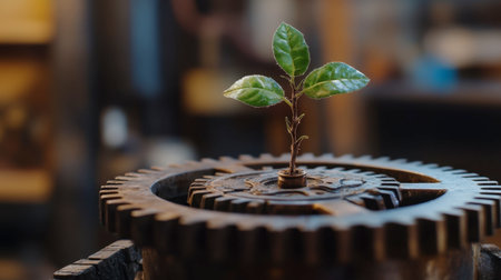 A green plant sprouts from a gear, symbolizing the connection between nature and industry. This image captures growth, renewal, and harmony in a mechanical world.
