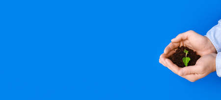 Male hands holding heap of soil with growing young plant on blue background with space for text
