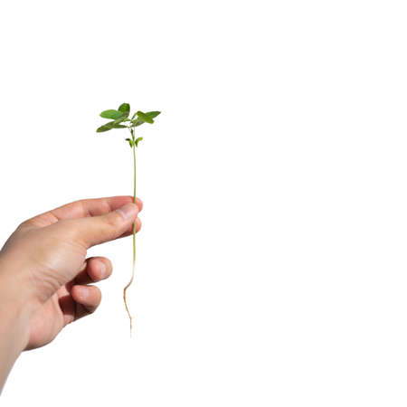 Sapling with root is hold on the man hand on white background., Clipping Paths.