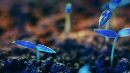 Blue plants growing. Futuristic surreal background. Germination. Unearthy modern wonderful world. Planet earth