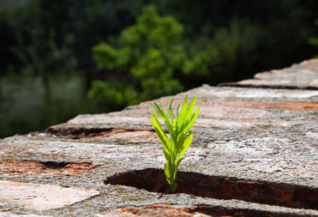 Young plant growing on an old brick wall