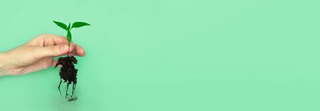 a young sprout in the ground and in a mans hand on a blue background