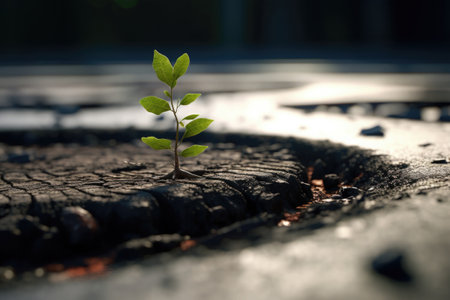 A resilient plant sprouts through concrete, symbolizing new life and growth in an urban environment. Hope and strength in nature shown.