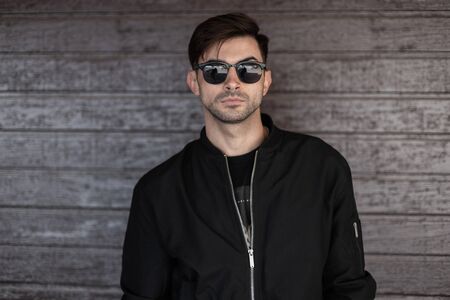 Sexy handsome young hipster man in black fashionable sunglasses with stylish hairstyle in vintage jacket stands near a wooden wall in the city. Handsome guy. Portrait of a man's face.