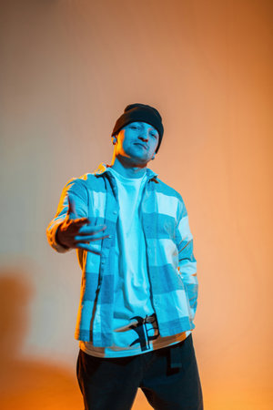 Stylish b-boy dancer guy with hat in a trendy fashion plaid shirt stands on an orange background with neon light