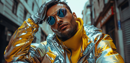 A man wearing sunglasses and a metallic jacket poses in a city setting.