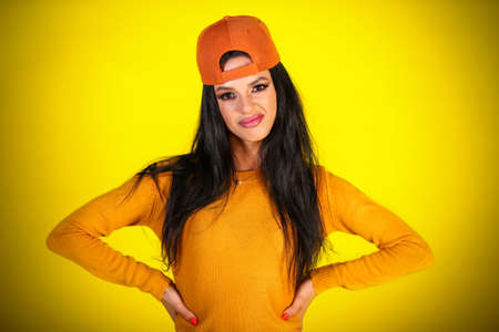 Young woman in a casual clothes looking disgusted over yellow background