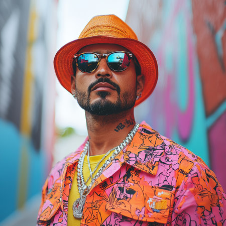 Man dressed in bold, colorful attire featuring bright sunglasses, accessories, and a vibrant background, radiating confidence and style.