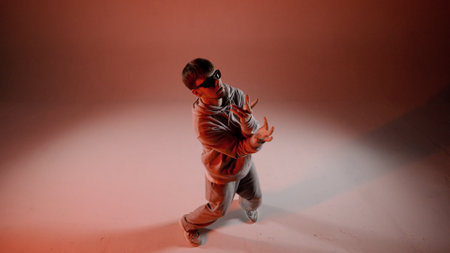 A man stands in the frame against a red background. The camera is slightly overhead. Demonstrates a dance movement, rays of light shine on him. Dressed in street style clothing. He is plastic