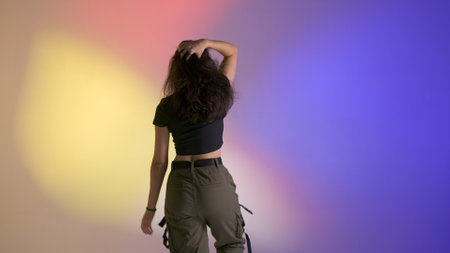 Attractive woman in top and black pants posing with her back at camera close up shot, dancing jazz funk in studio, isolated on neon background.