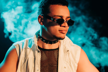 A man poses confidently with sunglasses on, showcasing a fashionable outfit against a backdrop of vivid colors and artistic lighting. The setting reflects a contemporary and creative atmosphere