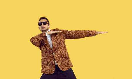 Funny young black man dancing isolated on a yellow colour background. Confident ethnic guy wearing a leopard jacket and cool sunglasses dancing to hip hop music in the studio