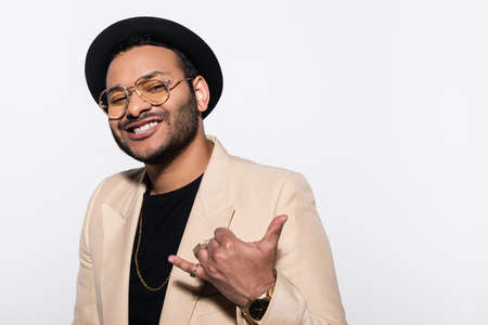 happy indian hip hop performer in fedora hat and eyeglasses showing call me gesture isolated on grey