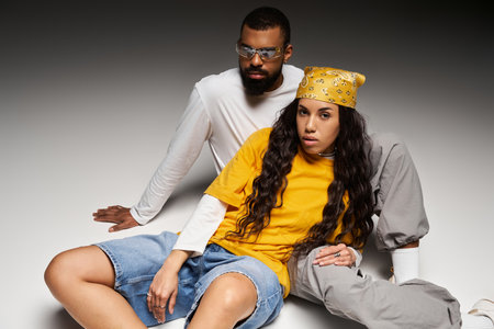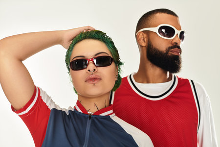 Multicultural couple showcases their unique style while wearing sunglasses in a studio setting.