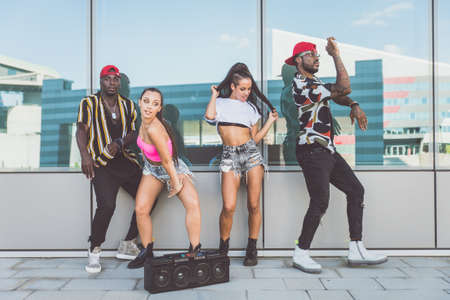 Group of hip hop dancers permorming their dance. Crew making show in an urban place