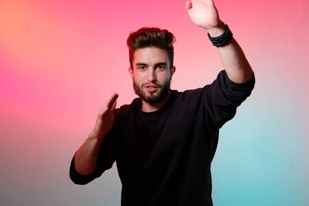 Glamour man dancing in smoke neon light,night club. Portrait of sexy guy