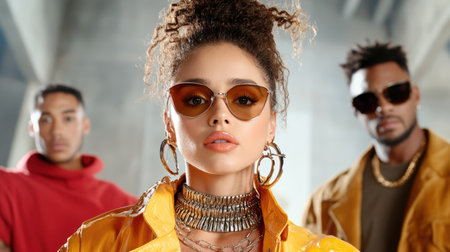 A Stylish woman in sunglasses with diverse friends in urban setting