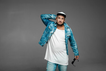 American young man with a beard in a cap in a t-shirt in a jacket in sunglasses is standing near a gray wall. Handsome hipster guy in the city. Fashionable men's clothing. Street style.