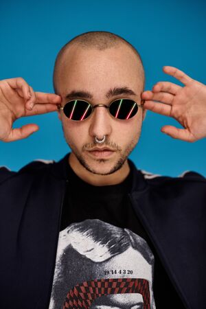 Studio shot of a young tattoed bald man posing against a blue background. 90s style.